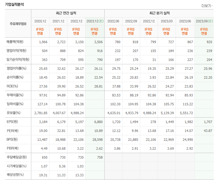 -2023년 6월 전년동기 대비 연결기준 매출액은 4% 증가, 영업이익은 9.3% 감소, 당기순이익은 0.2% 증가. 광고매출은 리그 및 콘텐츠 제작 수요 증가로 예상보다 빠른 광고 매출 턴어라운드를 달성, 플랫폼 매출은 코어 유저들의 ARPU 증가로 성장. 9월 아시안게임(e-스포츠 포함) 중계, 게임 광고주들의 게임 런칭 및 광고 집행, 연말 G-STAR 오프라인 행사, 비게임 광고주들의 수요 증가 등으로 호실적이 기대됨.