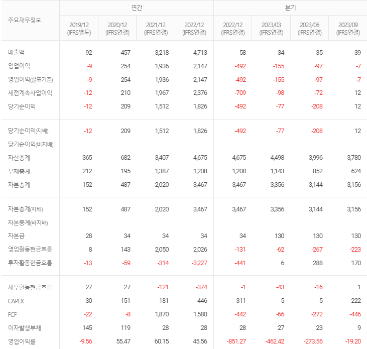 -2023년 6월 전년동기 대비 연결기준 매출액은 98.4% 감소, 영업이익 적자전환, 당기순이익 적자전환. 동사는 매출이 전년동기 대비 98%가 감소하면서 외형이 급격히 축소됐고, 이에 따른여파로 영업이익과 당기순이익이 적자로 전환함. 헬스케어 산업에 불고 있는 Bio기술과 인공지능 IT기술의 융합에 대응하기 위해서 모바일 헬스케어 분야의 제품 연구 개발 및 투자하고 있음.