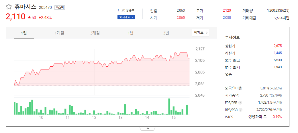 휴마시스 현재 주가는 2,060원이며 전일 대비 -60원의 모습을 보이고 있습니다. 휴마시스의 주주현황을 살펴보면 아티스트(외 3인)이 지분 13.38%를 소유하고 있습니다. 휴마시스는 의료 장비 및 서비스 기업으로 장중 기준으로 주가는 2,060원 입니다. 휴마시스 시가 총액은 2730억 원이며 발행 주식수는 5.01주 입니다. 외국인 보유 비중은 1,925,845% 이며 장중 거래량은 129,375,009를 기록했습니다. 매출액은 108억 원, 영업이익은 2,147억 원을 달성했습니다. 휴마시스 주식 배당수익률은 888,432% 입니다.