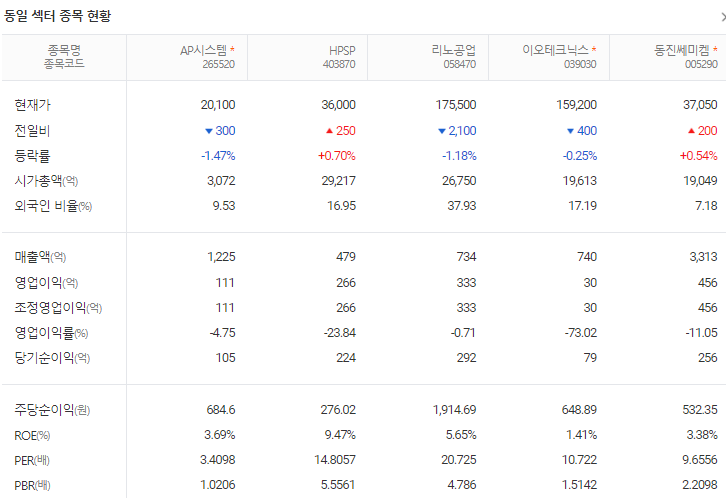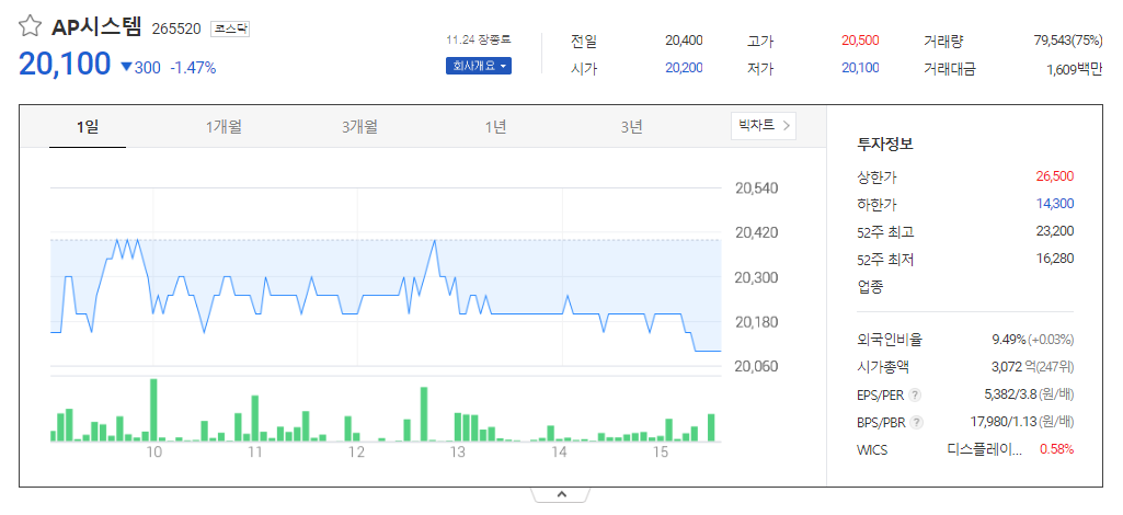 AP시스템 현재 주가는 20,400원이며 전일 대비 -3.32원의 모습을 보이고 있습니다. AP시스템의 주주현황을 살펴보면 APS홀딩스(외 4인)이 지분 25.07%를 소유하고 있습니다. AP시스템는 디스플레이 및 관련부품 기업으로 장중 기준으로 주가는 20,400원 입니다. AP시스템 시가 총액은 3087억 원이며 발행 주식수는 9.49주 입니다. 외국인 보유 비중은 105,282% 이며 장중 거래량은 15,281,421를 기록했습니다. 매출액은 2,165억 원, 영업이익은 905억 원을 달성했습니다. EPS는 4,155원이며 AP시스템 주식 배당수익률은 36.03% 입니다.