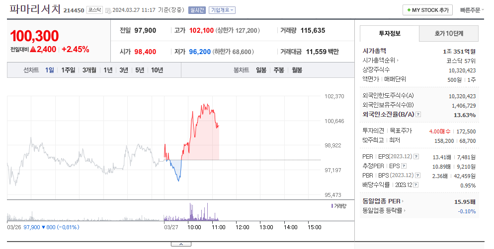 파마리서치 현재 주가는 97,900원이며 전일 대비 -800원의 모습을 보이고 있습니다. 파마리서치의 주주현황을 살펴보면 정상수 주주가 전체 지분 38.89%를 소유하고 있습니다. 파마리서치는 의료 장비 및 서비스 기업으로 장중 기준으로 주가는 97,900원 입니다. 파마리서치의 시가 총액은 1조537억 원이며 발행 주식수는 10,320,423주 입니다. 외국인 보유 비중은 13.63% 이며 장중 거래량은 125,420원 을 기록했습니다. 매출액은 2,610억 원을 달성했습니다. EPS는 9,210원이며 파마리서치 주식 배당수익률은 0.96% 입니다.