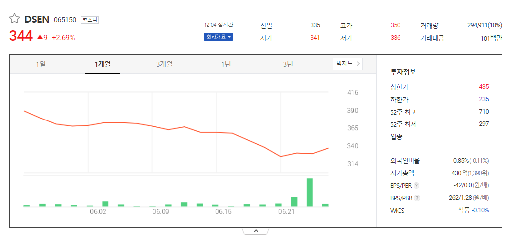 DSEN 현재 주가는 335원이며 전일 대비 -1원의 모습을 보이고 있습니다. DSEN의 주주현황을 살펴보면 얼머스인베스트먼트(외 1인)이 지분 31.93%를 소유하고 있습니다. DSEN는 식료품 기업으로 장중 기준으로 주가는 335원 입니다. 삼성전자의 시가 총액은 430억 원이며 발행 주식수는 0.85주 입니다. 외국인 보유 비중은 2,910,189% 이며 장중 거래량은 125,282,405를 기록했습니다. 매출액은 335억 원, 영업이익은 -54억 원을 달성했습니다.