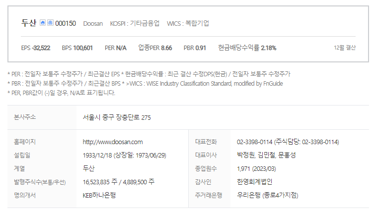 이 글에서는 두산 주가 전망과 목표 주가, 기업 정보에 대해서 설명합니다. 주식 투자를 하려면 기업 주가와 재무 현황표에 대해서 알아보는 것은 매우 중요합니다. 두산 주식의 주요 현황과 투자 정보를 확인하시고 주가 흐름을 파악해보겠습니다.