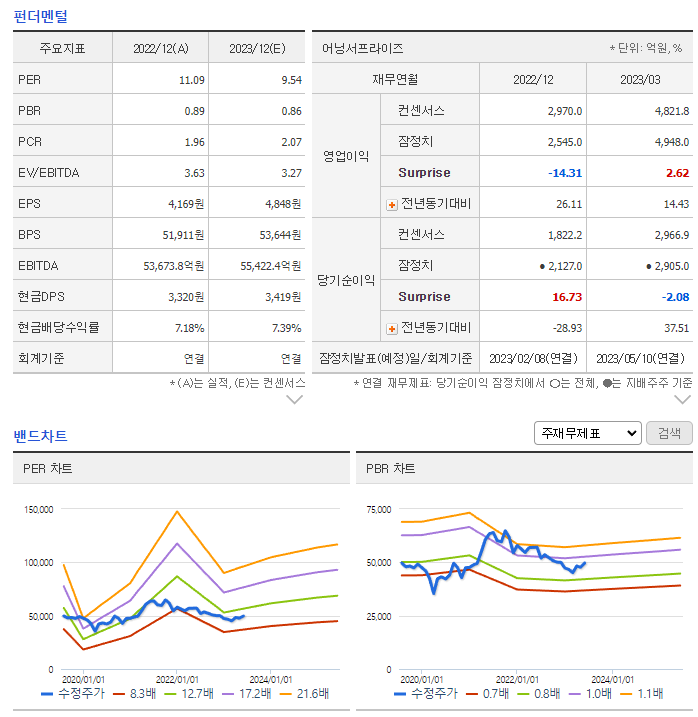 -2023년 3월 전년동기 대비 연결기준 매출액은 2.2% 증가, 영업이익은 14.4% 증가, 당기순이익은 37.5% 증가. 주력인 무선통신부문의 실적 확대와 함께 초고속 인터넷 등 유선부문의 선전으로 영업수익 확대됨. 원가율 또한 개선되며 영업수익성 또한 비교적 큰 폭으로 증가한 모습. 실적 개선을 위해 5G 통신망 구축을 주도하고 빅데이터, AI를 접목한 서비스를 선보이는 등 다방면으로 노력 중임.