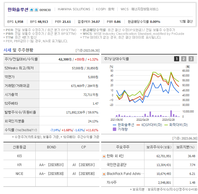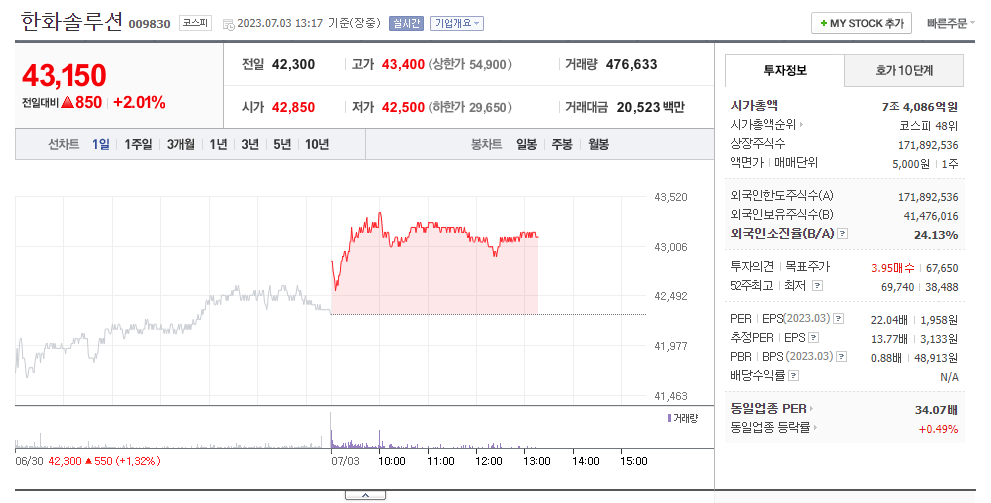 이 글에서는 한화솔루션 주가 전망과 목표 주가, 기업 정보에 대해서 설명합니다. 주식 투자에 앞서 기업 현황고 현재 시장 흐름에 대해서 살펴보는 것이 굉장히 중요합니다. 한화솔루션 주식의 주요 현황과 투자 정보를 확인하시고 현재 시장 현황을 살펴보겠습니다.