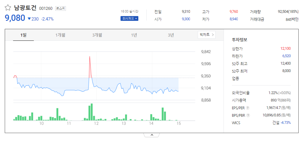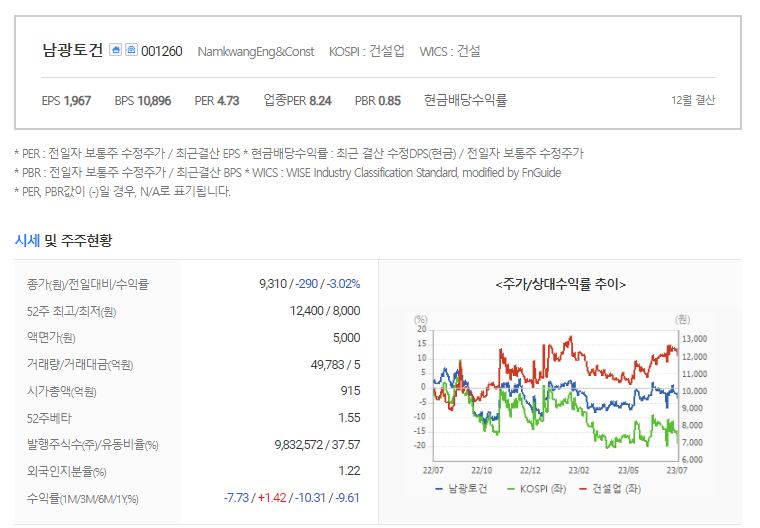 이 글에서는 남광토건 주가 전망과 목표 주가, 기업 정보에 대해서 설명합니다. 주식투자 전에 기업 현황고 현재 시장 흐름에 대해서 알아보는 것이 필요합니다. 남광토건 주식의 주요 현황과 투자 정보를 확인하시고 지금 시장에서 위치를 파악해보겠습니다.