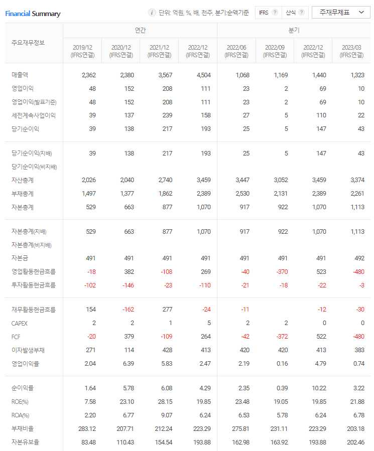 -2023년 3월 전년동기 대비 연결기준 매출액은 59.9% 증가, 영업이익은 41.5% 감소, 당기순이익은 160.1% 증가. 매출이 크게 증가하였음에도 주요 원재료 중 철근의 가격이 45.5%, 아스콘의 가격이 45.8% 증가함에 따라 매출 증가분을 원가 증가분이 상쇄하면서 영업이익이 큰폭으로 감소함. 철근 및 시멘트 등 건설자재 가격 하락이 제한되고 있고 신규 분양이 소폭 하락할 것으로 예상되면서 불확실성이 높아지고 있음.